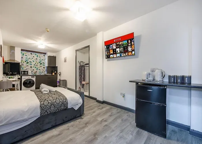 Los apartamentos disponen de una cocina completa con horno. El 78F1- Modern & Stylish Studio se encuentra a tan solo 450 m de la estación de autobuses H11 Bradford Hall Ings.